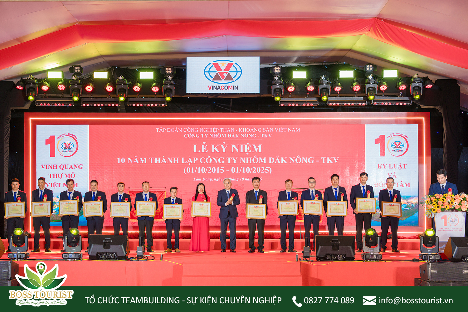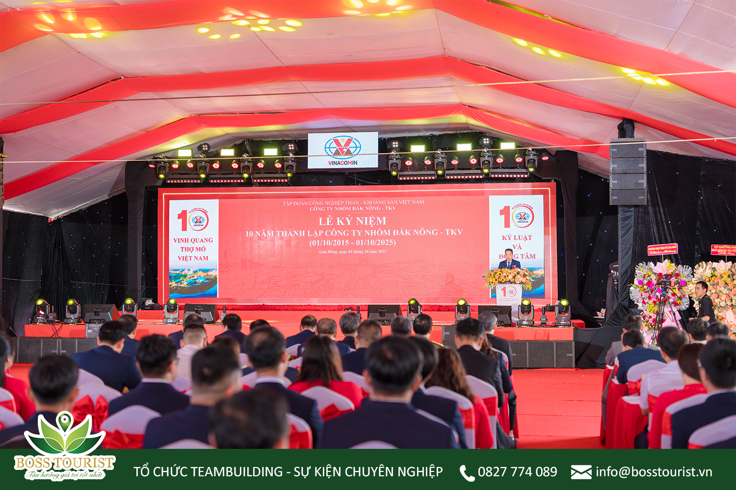 Với hơn 300 đại biểu tham dự, bao gồm lãnh đạo Tỉnh ủy Lâm Đồng, Tập đoàn Than – Khoáng sản Việt Nam (TKV), các sở ban ngành, cùng toàn thể cán bộ công nhân viên, sự kiện được Boss Tourist tổ chức bài bản, chuyên nghiệp và đầy cảm xúc. Không gian Lễ kỷ niệm được thiết kế theo chủ đề “10 năm – Vững bước tương lai”, kết hợp giữa yếu tố truyền thống và công nghệ hiện đại, mang đến trải nghiệm ấn tượng cho người tham dự.